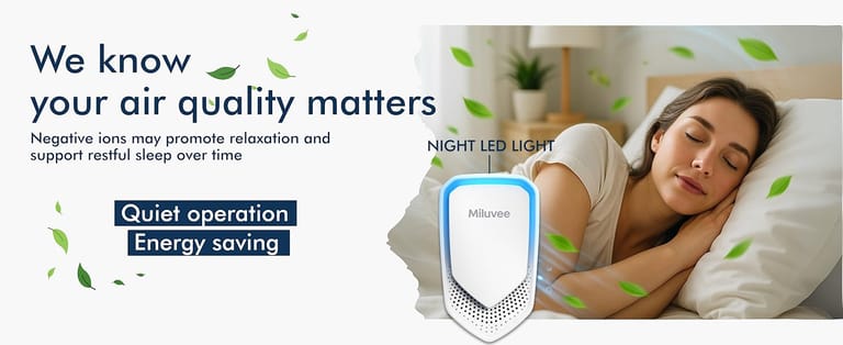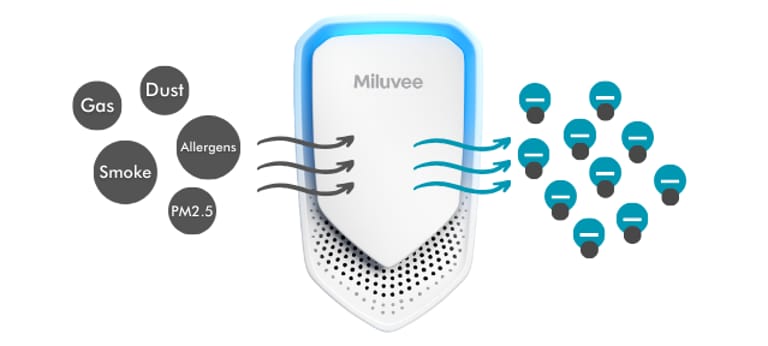 The Miluvee air purifier uses advanced ionization technology to continuously release millions of negative ions: the same revitalizing particles found in nature. These ions bind with dust, smoke, pet dander, allergens, and even harmful gases like formaldehyde, removing them from the air, resulting in a healthier, fresher environment without filters, refills, or chemical sprays.