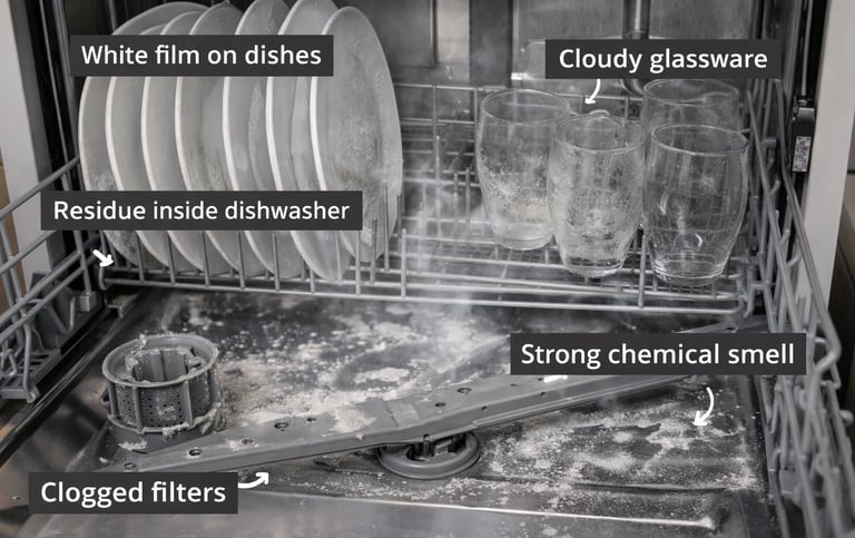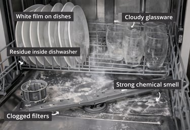 Many users notice issues after using certain pods or tablets for a long time. Some of the most common problems include: white film on dishes, cloudy glassware, residue inside the dishwasher, clogged filters, and strong chemical smell. When this happens, people often think the dishwasher is broken. In many cases, the real cause is the detergent formula.S ome pods contain heavy fillers, strong chemicals, or thick coatings that do not dissolve completely. Over time, this can leave buildup inside the machine.
