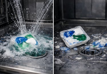 Pods and tablets were designed to make dishwashing easier. Each pod contains a measured amount of detergent sealed inside a dissolvable coating.When the dishwasher runs, the coating melts and releases the detergent during the wash cycle. This makes cleaning easier because: no measuring, no powder mess, no liquid spills, and no guessing how much to use. Many pods also include rinse aid, degreasers, and extra cleaning agents, which helps remove dried food more easily. Because of this, pods often clean better than traditional powder detergent. However, the stronger formula can sometimes cause new problems.